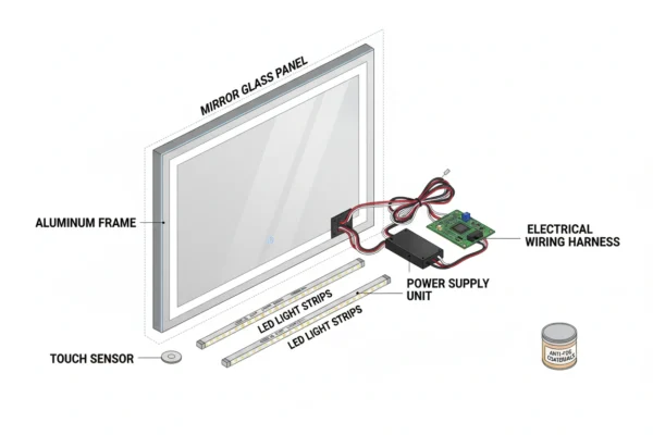 LED Light Strips: Energy-efficient LED strips provide consistent illumination around the mirror perimeter. These strips must offer uniform brightness distribution and long operational life, typically rated for 50,000+ hours.